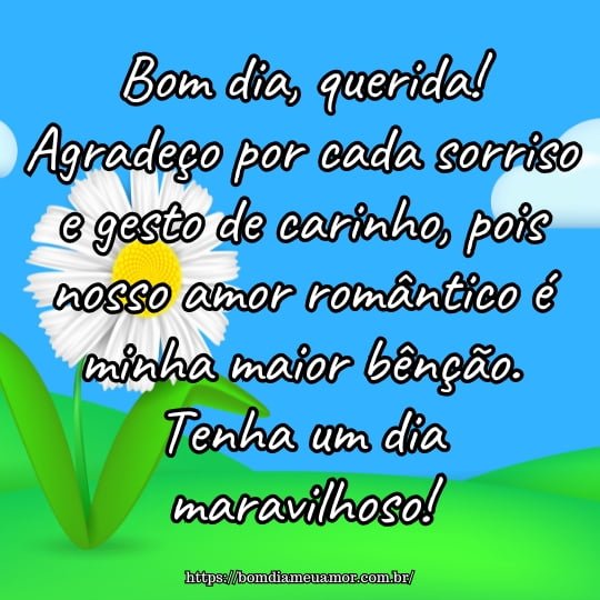 Bom dia, querida! Agradeço por cada instante romântico que compartilhamos, pois você é a luz dos meus dias. Tenha um dia incrível!